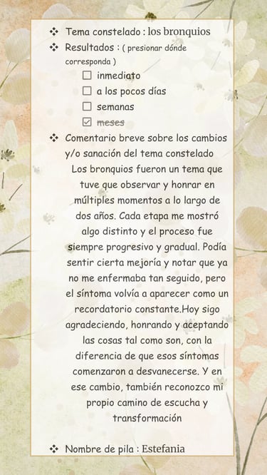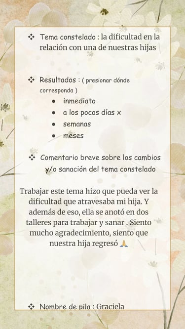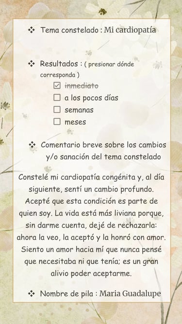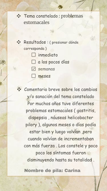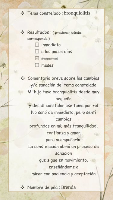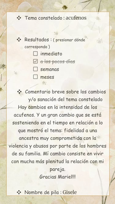 Algunos se sienten removidos, raros, durante unos días. A veces se produce una resolución físicamente dolorosa, como dolores, gripe, cansancio. Cuídate, son etapas normales de “desintoxicación”... Durante los días que siguen tu constelación estarás en un período de sensibilidad y emotividad agudizadas, con la memoria y el inconsciente muy abiertos, como si estuvieras energizado o en un estado alterado de conciencia. Por ese motivo es muy aconsejable durante estos dos días una terapia energética, pues el efecto de la constelación y de esa terapia se potenciará mutuamente. Después, durante varias semanas, incluso varios meses y en algunos casos años, continuarás procesando la información recibida el día de tu Constelación. En ese período se elaborarán los cambios sistémicos y energéticos que tendrán lugar en ti, en otros miembros de tu familia y en las personas que resuenan contigo. Son cambios muy profundos y sutiles: cambios de creencias, cambios de energía que implican que soltarás varias compensaciones a las que tienes mucho apego, te llegarán nuevas metas.