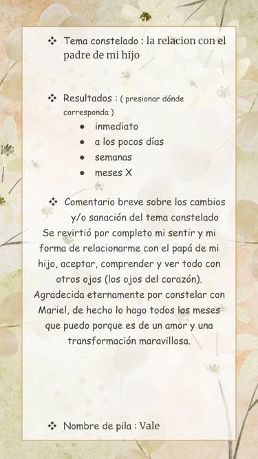 Lo esencial para mí hoy, en el momento presente. En el camino de vida que llevo, ¿Qué es lo que realmente necesito? ¿Qué es lo que intento una y otra vez y no consigo? ¿Existe un patrón de repetición en mi vida, mis actitudes, mis elecciones? ¿Algo ha ocurrido, algo que no puedo integrar? Por lo tanto podremos constelar… salud, enfermedad, síntomas, compulsiones, relaciones, vínculos, trabajo, dinero, emociones desproporcionadas, pareja, hijos, embarazo, parto nacimiento, animales, mascotas y todo aquello que nos esté frenando, llevando hacia el fracaso, el malestar, todo lo que no nos permita estar en la vida y la realización.